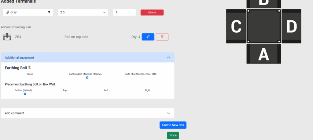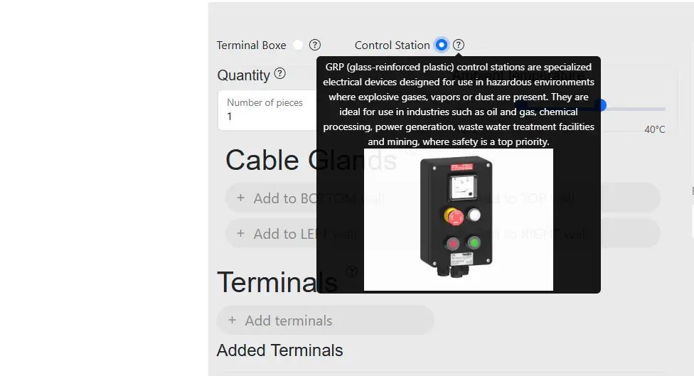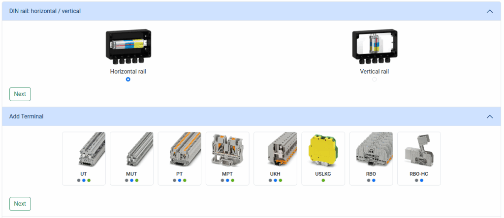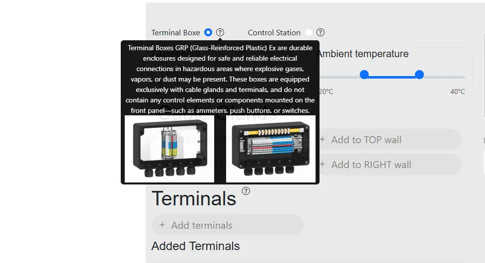 Na początku użytkownik wybiera typ obudowy. Terminal Box to standardowa obudowa z zaciskami elektrycznymi, natomiast Control Station to zaawansowana obudowa z możliwością montażu przycisków, lamp sygnalizacyjnych i innych komponentów sterujących.