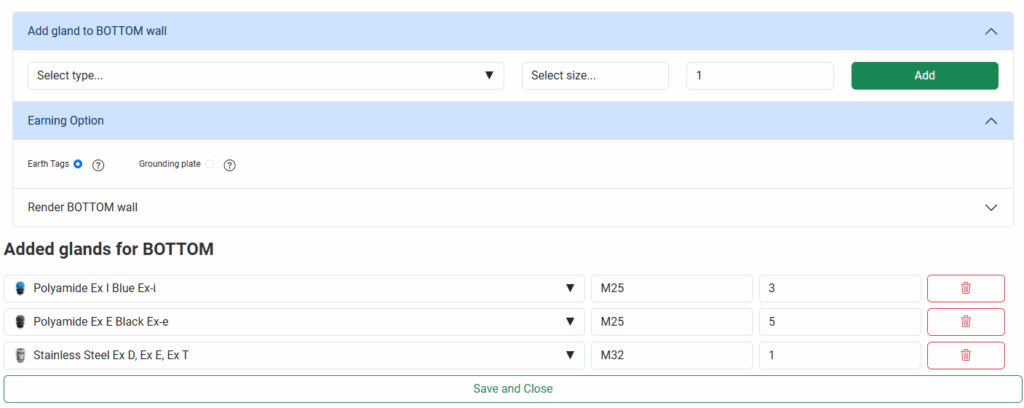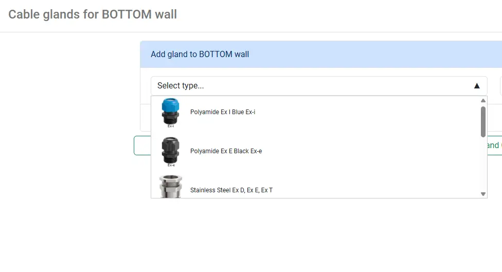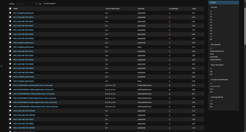 To jest serce naszego konfiguratora. Użytkownik może dodawać dławiki kablowe w różnych rozmiarach metrycznych – od M12 do M75 System automatycznie: