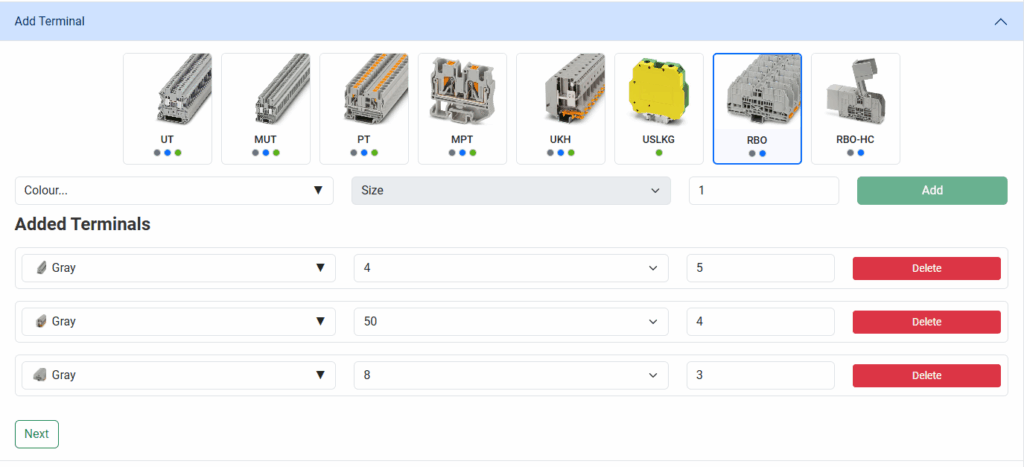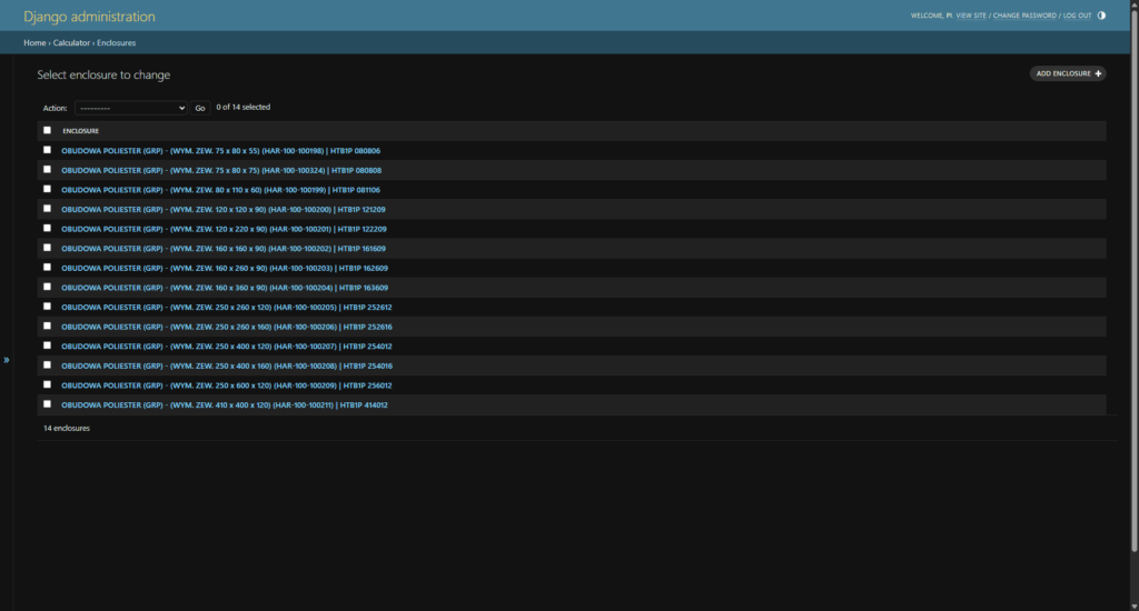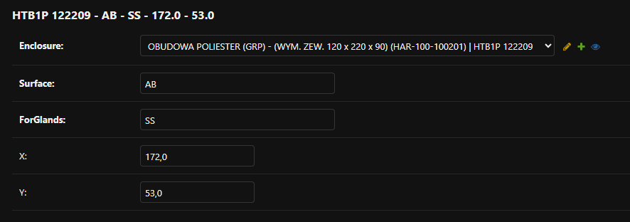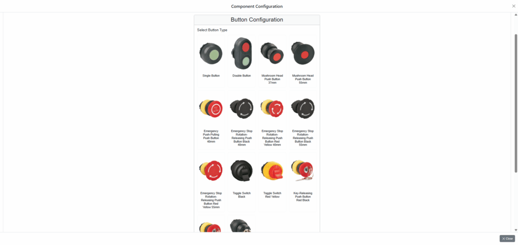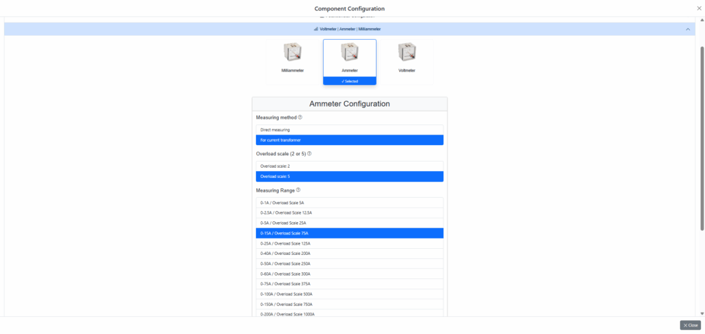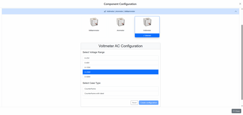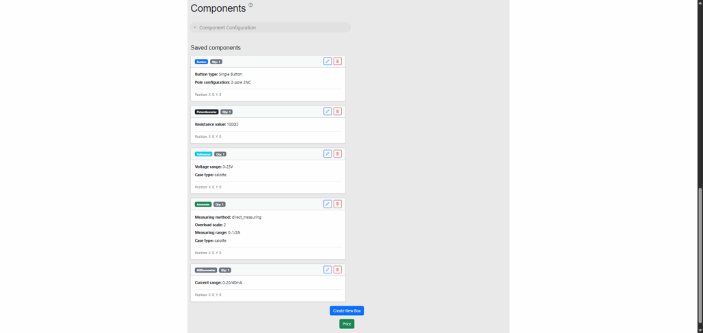 Obecnie system posiada uproszczony sposób wprowadzania danych – interfejs w React/TypeScript jest intuicyjny i wykorzystuje interaktywne komponenty. Modułowa selekcja obejmuje główne grupy elementów, takie jak dławiki, terminale, przyciski, przełączniki, lampki, woltomierze, amperomierze, miliamperomierze i potencjometry. System doboru obudów pozwala na wybór optymalnej skrzynki, a konfiguratory dławików i terminali umożliwiają precyzyjne zestawianie komponentów. Te części są gotowe i wymagają jedynie testów.