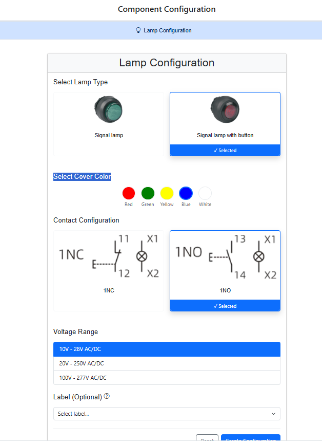 To ekran konfiguracji pojedynczej lampki sygnalizacyjnej w konfiguratorze obudów ATEX. Użytkownik krok po kroku definiuje wszystkie istotne parametry komponentu frontowego