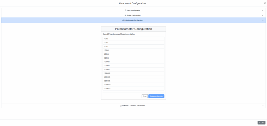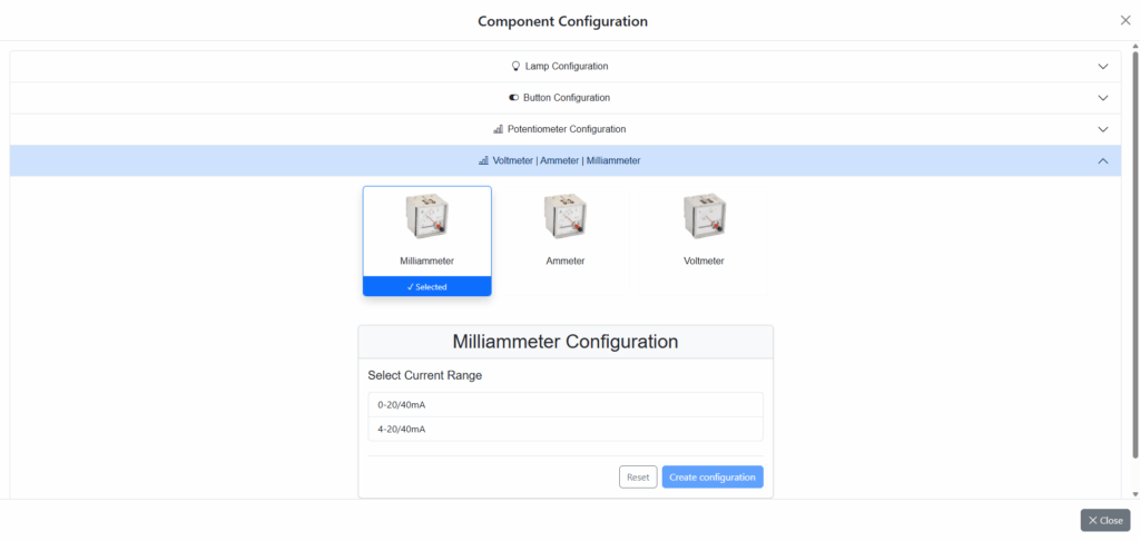 - Voltmeter / Ammeter / Milliammeter – konfiguracja mierników napięcia, prądu