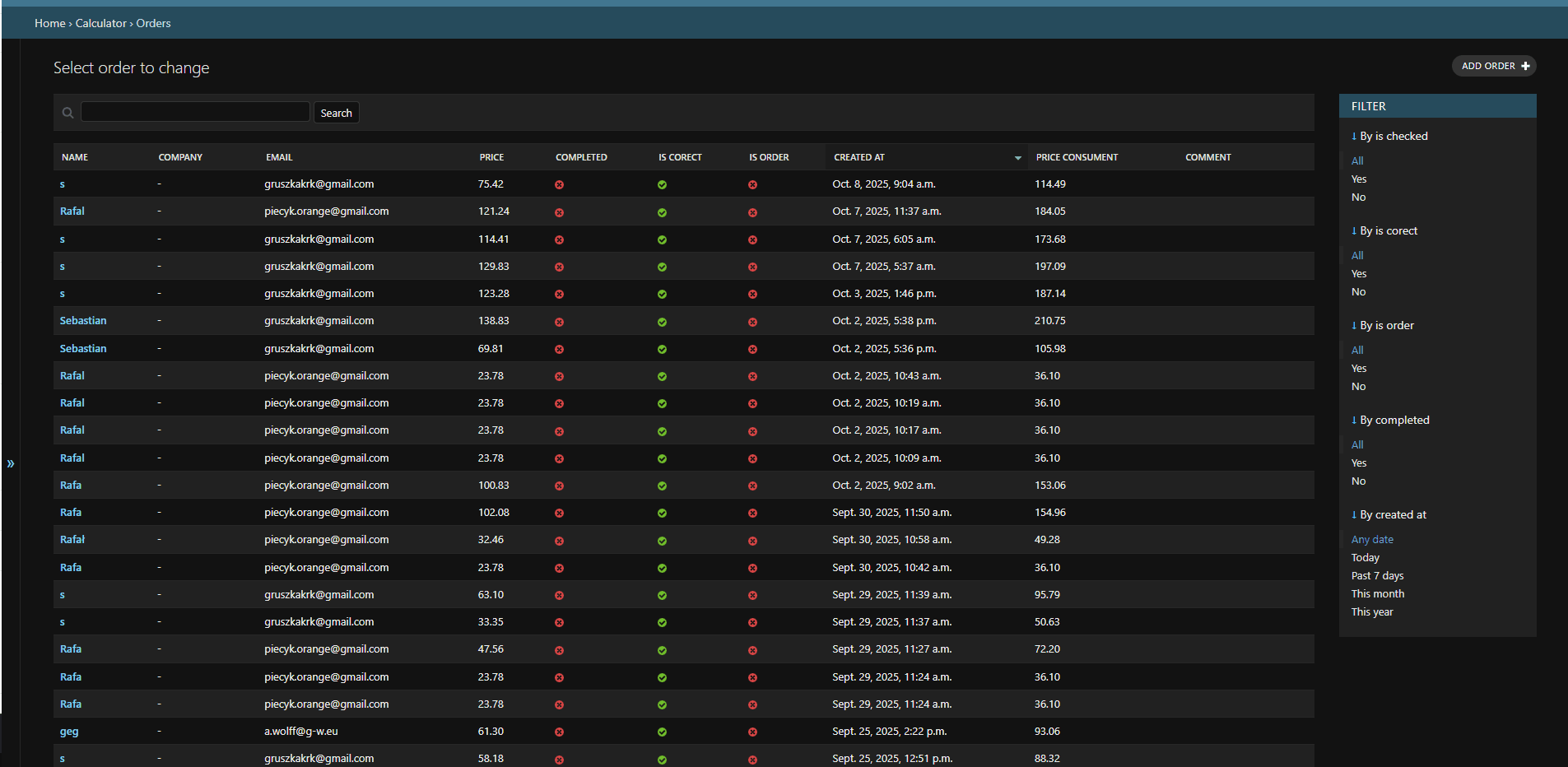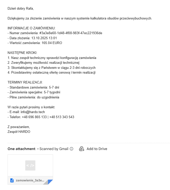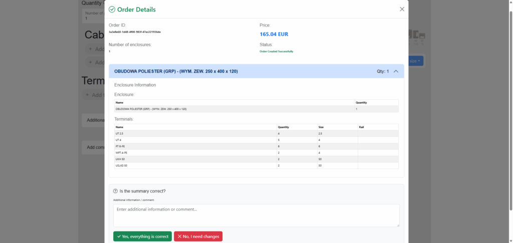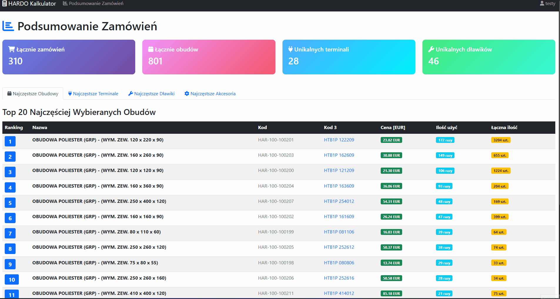 W ramach systemu zarządzania zamówieniami działa już automatyczne obliczanie cen, a pełna struktura zamówienia zapisywana jest w formacie JSON. Baza danych obejmuje kategorie produktów i szczegółowe modele (terminale z pełną specyfikacją, dławiki z parametrami technicznymi, obudowy z wymiarami i certyfikatami, system akcesoriów).