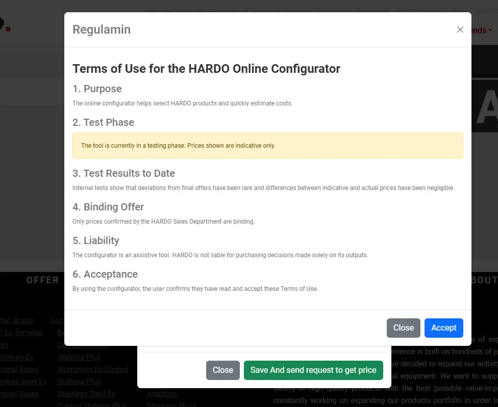 Na ekranie pojawia się okno typu modal, zatytułowane „Regulamin / Terms of Use for the HARDO Online Configurator”,